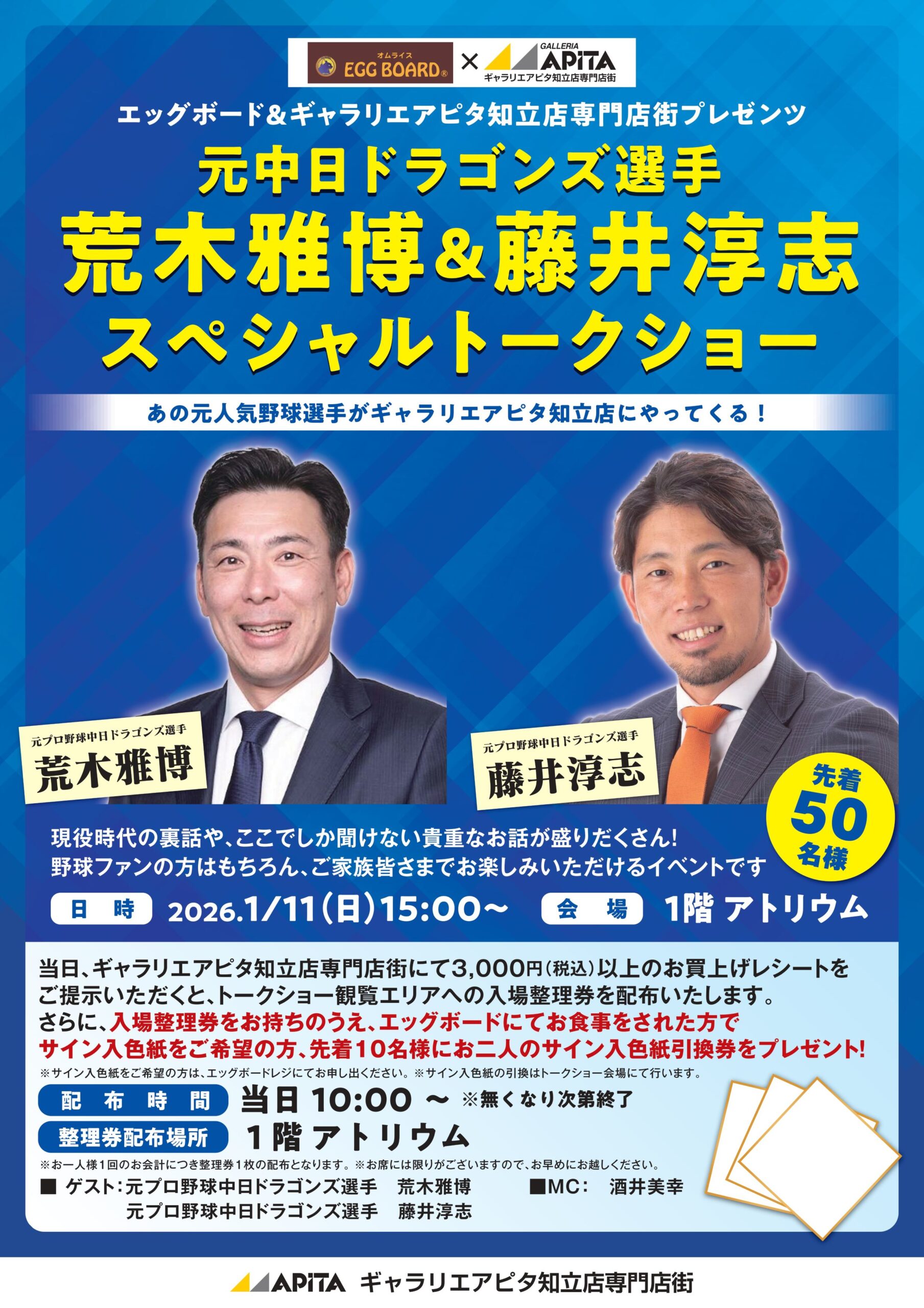 さらに入場整理券をお持ちのうえ、エッグボードにてお食事をされた方でサイン入色紙をご希望の方、先着10名様にお二人のサイン入色紙引換券をプレゼント!