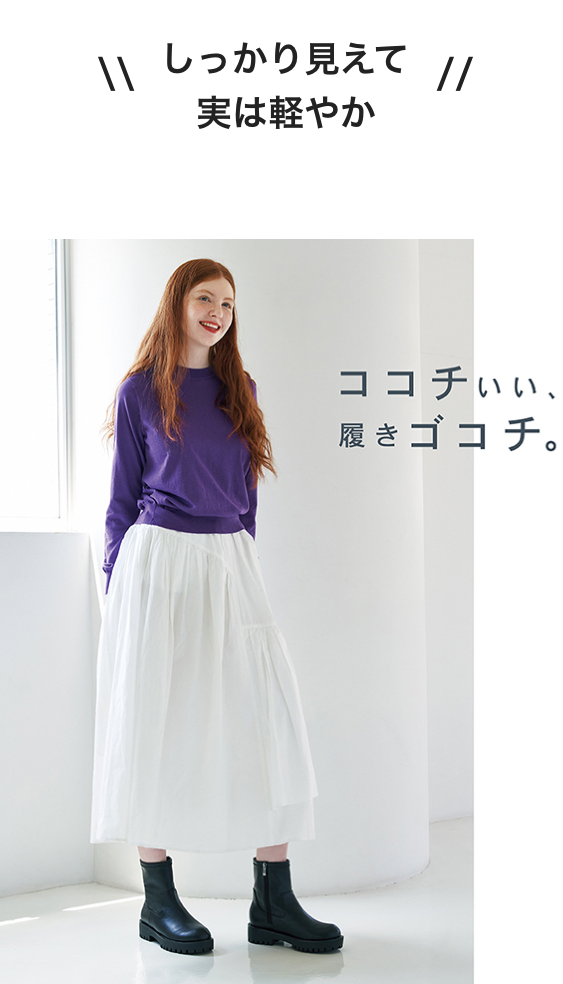 トレンドのボリュームソールが可愛らしい1足ですが、見た目に以上に軽量で歩きやすいブーツです。